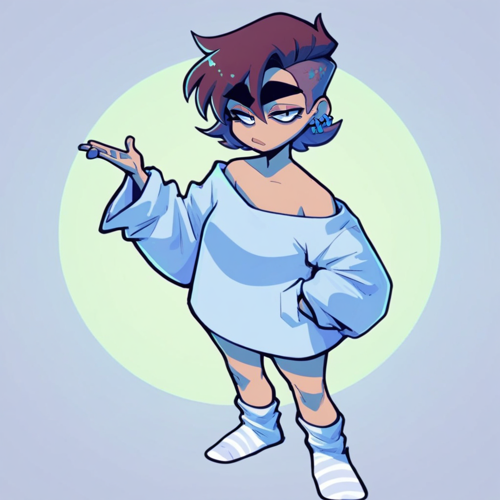 Blue shirt, off-shoulder shirt, oversized shirt, long sleeves, socks