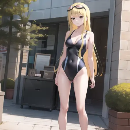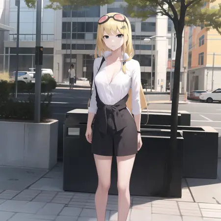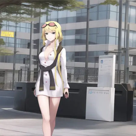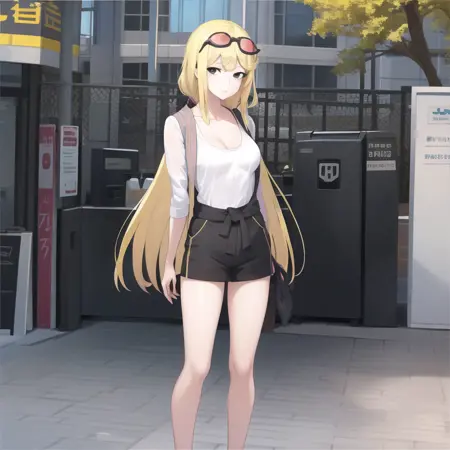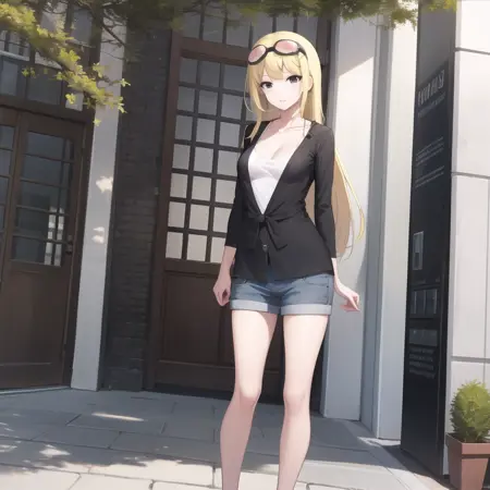 트리거 단어: dscs-kyoko, 흰색 재킷, 짧은 반바지, 스카프, 벌어진 옷, 금발, 긴 머리