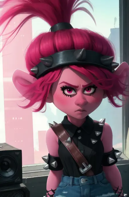 QueenPoppy, pink hair, ponytail, pink eyes, pointy ears,