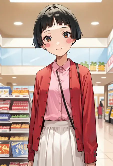 분홍색 셔츠, 빨간 카디건, 흰 치마