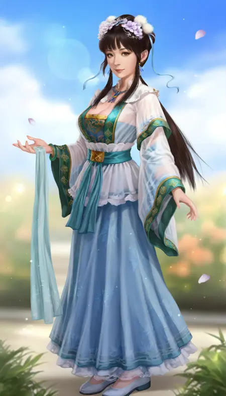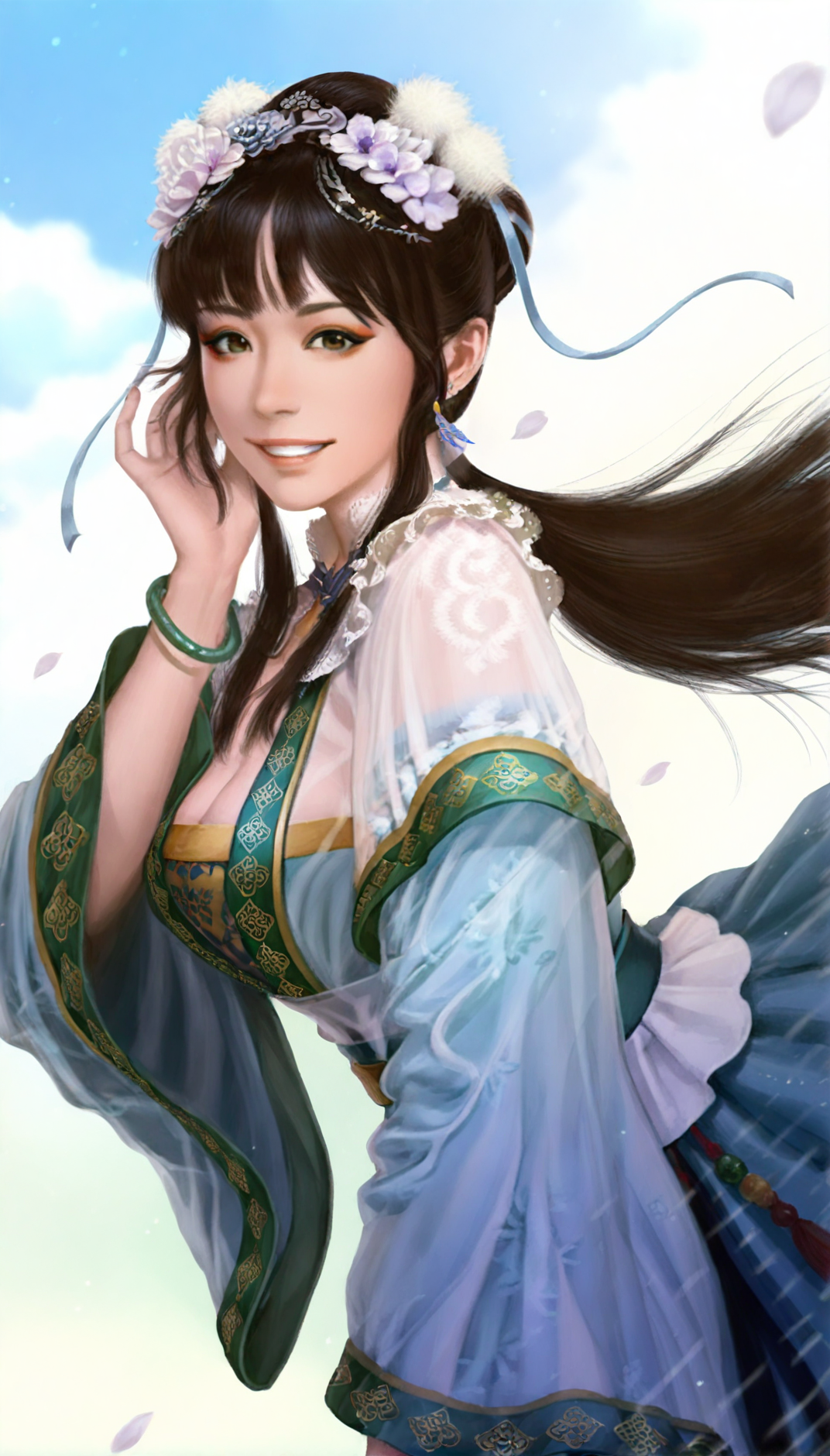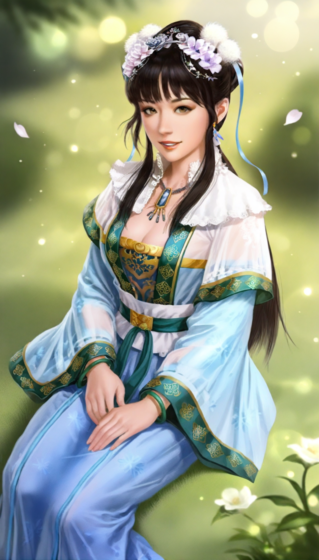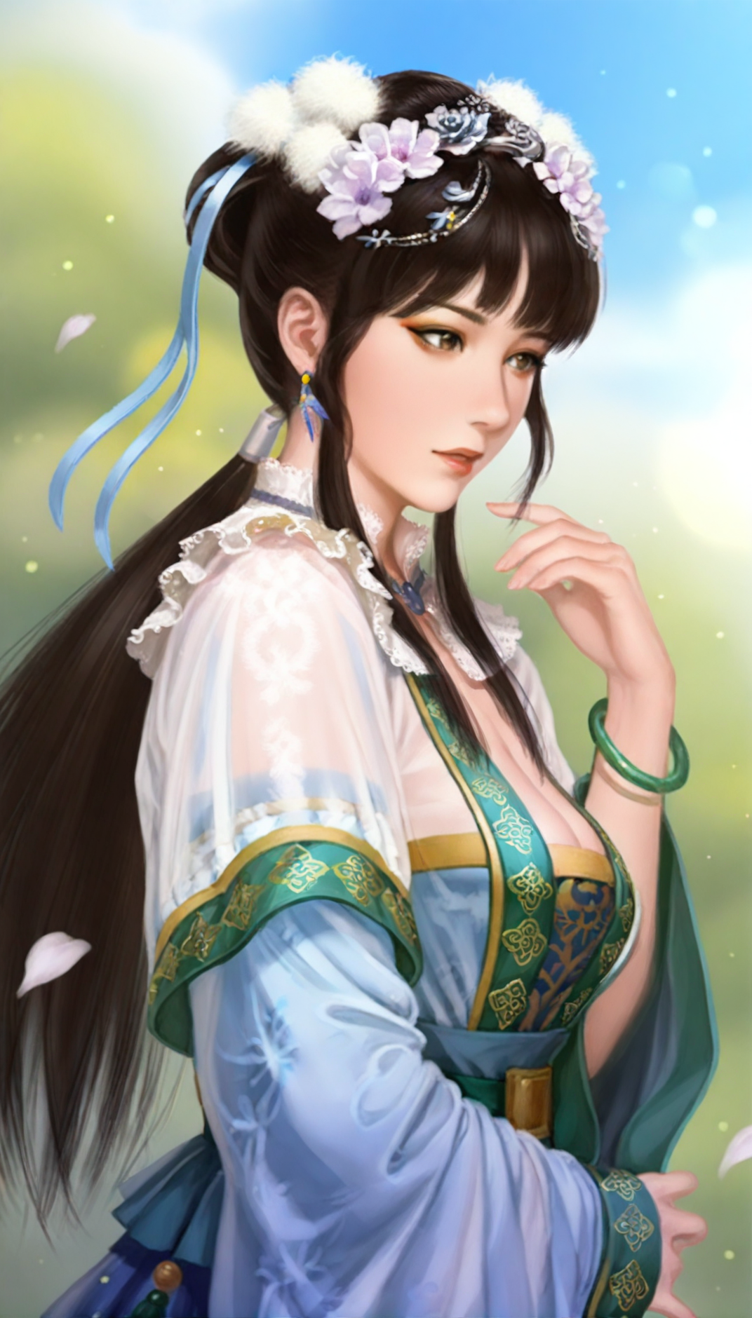 wangyuanji, realistic, 1girl, solo, black hair, blunt bangs, updo, low ponytail, white scrunchie, hair ornament, white hair pom pom, purple hair flower, blue hair ribbon, blue earrings, grey eyes, lace collar, necklace with blue gem, intricate frills and lace, layered blue and white fabric, sheer outer robe, blue inner robe, blue long sleeves with green trim, white waist sash, green waist belt, green jade bracelet, a jade pendant as a waist decoration,