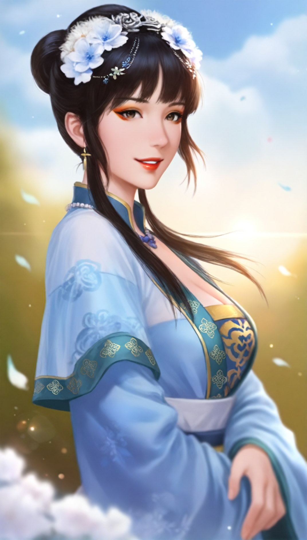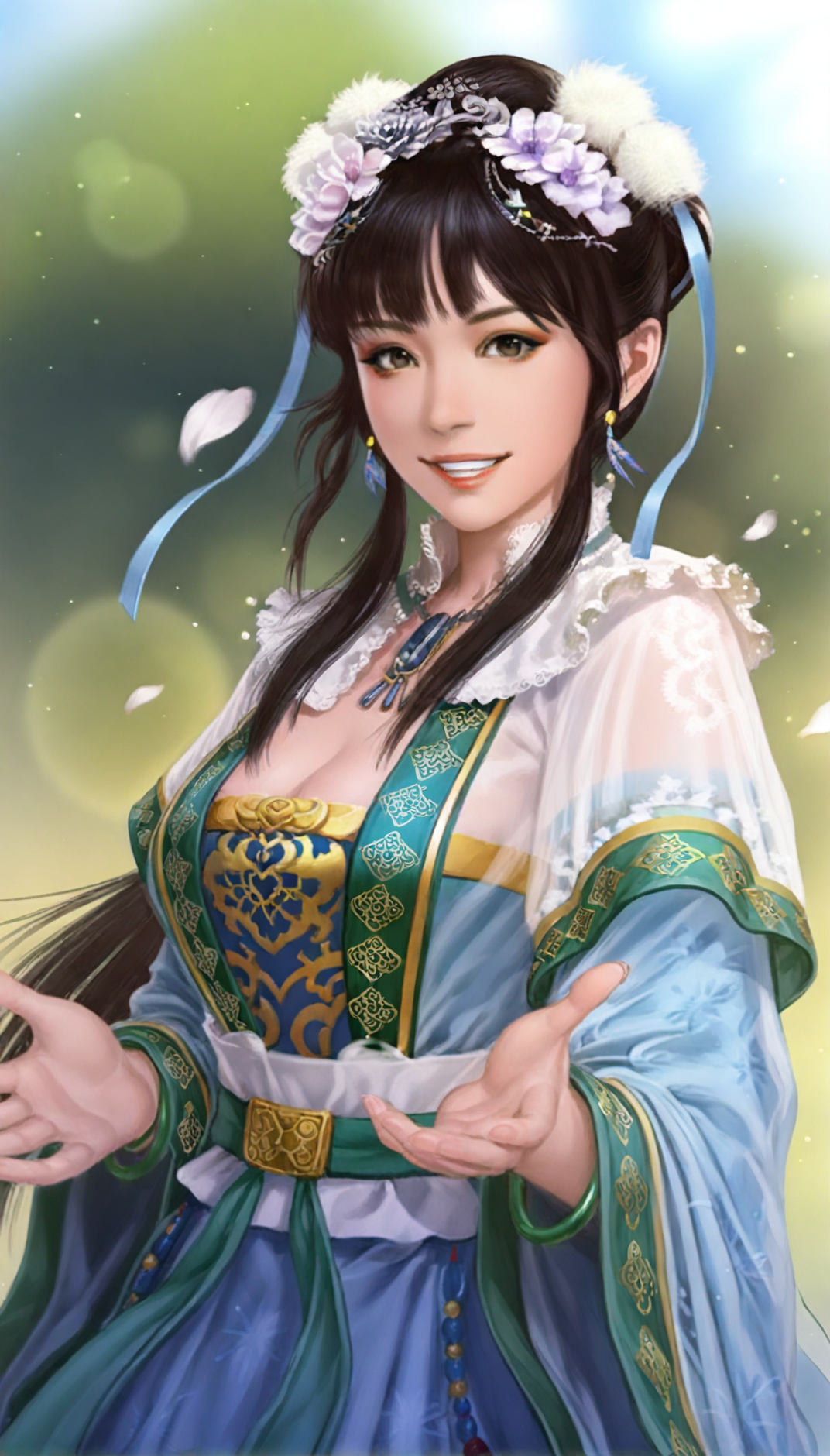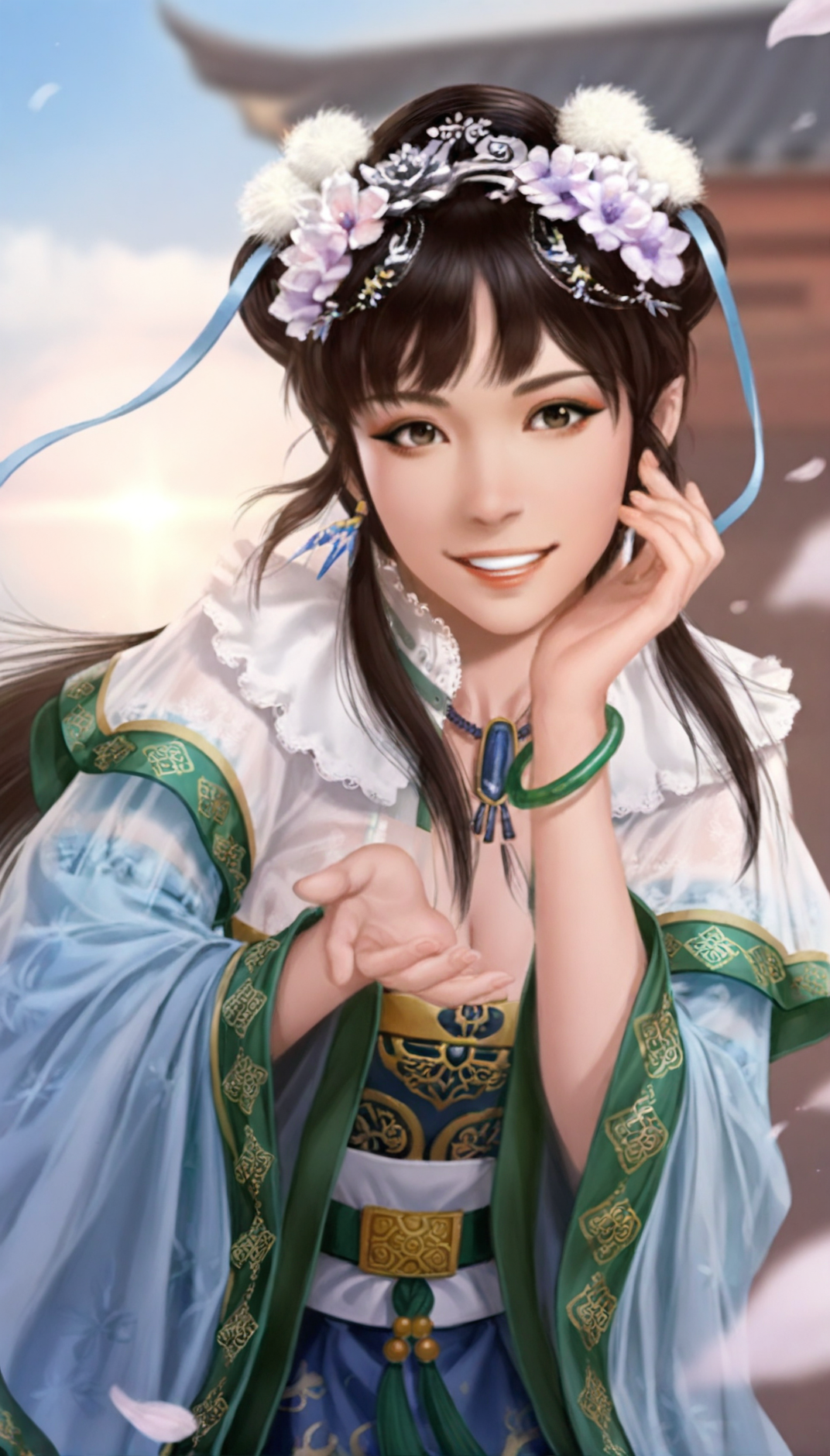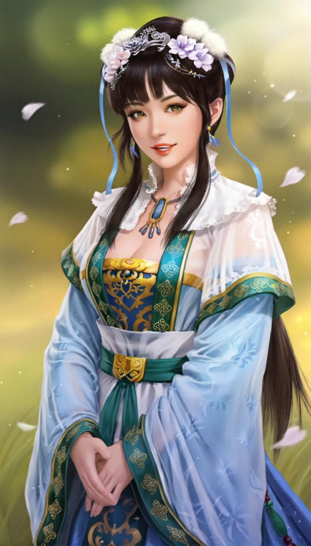 wangyuanji, realistic, 1girl, solo, black hair, blunt bangs, updo, low ponytail, white scrunchie, hair ornament, white hair pom pom, purple hair flower, blue hair ribbon, blue earrings, grey eyes, lace collar, necklace with blue gem, intricate frills and lace, layered blue and white fabric, sheer outer robe, blue inner robe, blue long sleeves with green trim, white waist sash, green waist belt, green jade bracelet, a jade pendant as a waist decoration,
