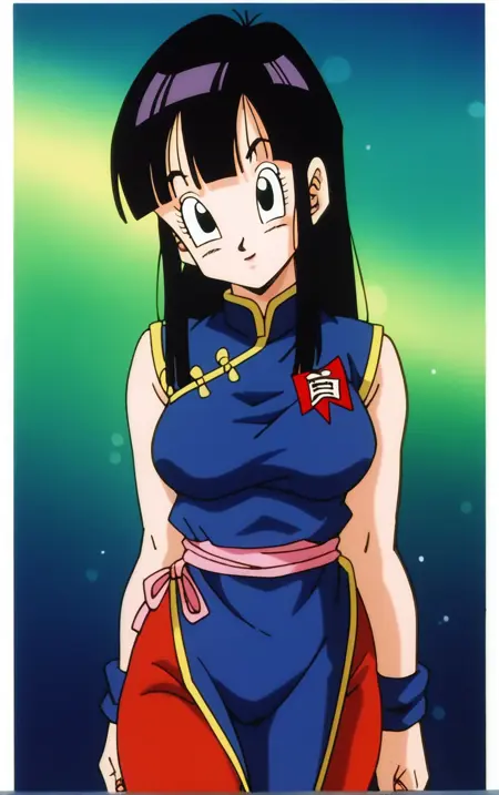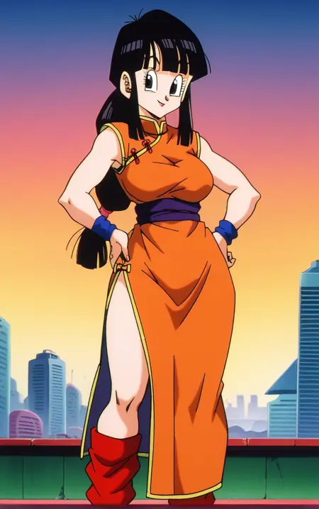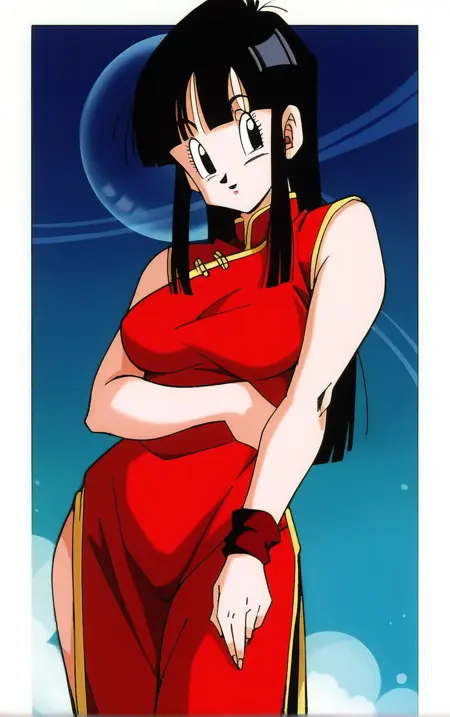 1girl, black hair, chi-chi \(dragon ball\), black eyes, blunt bangs, blunt sidelocks, china dress, chinese clothes, leg warmers, low-tied long hair, red pants, sleeveless, wristband, breasts,