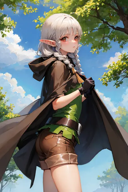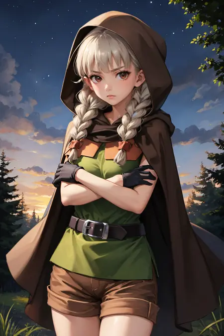 添加 "双辫子、斗篷、棕色长袍、绿色上衣、手套、腰带、棕色短裤、大腿长靴" 以呈现她的典型造型。