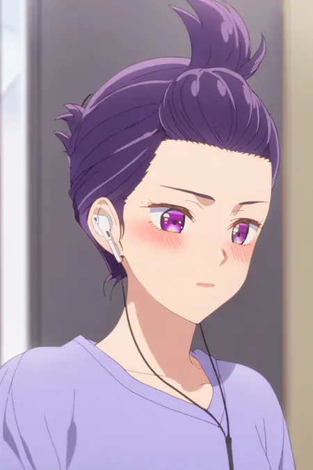 사유리: 사유리, 보라색 눈, 보라색 머리, 긴 머리, 머리 장신구, 눈 밑 점, 큰 가슴,
