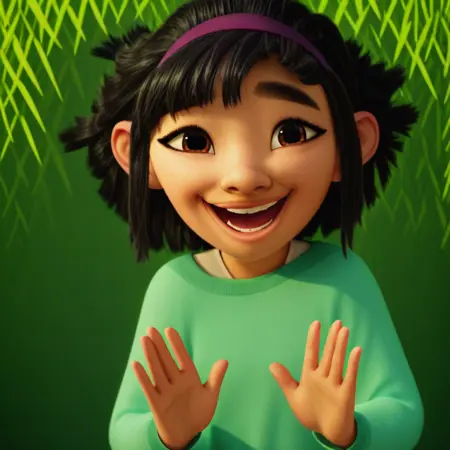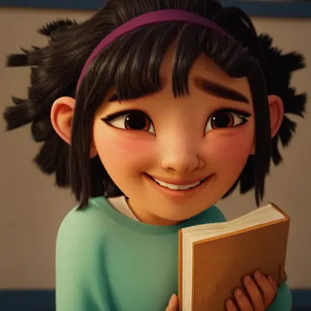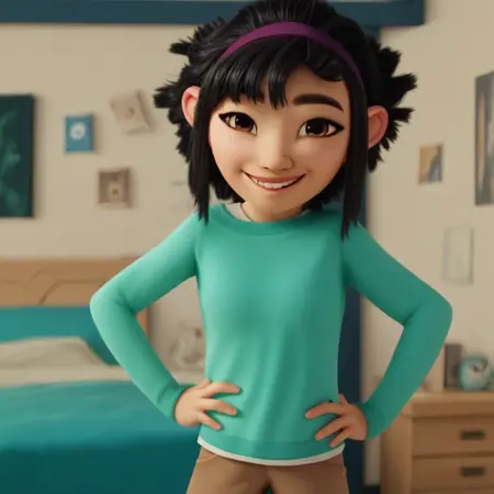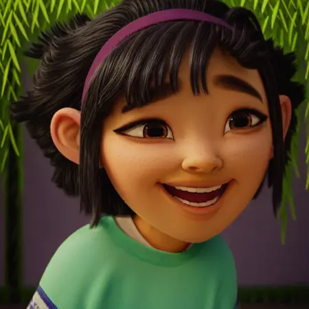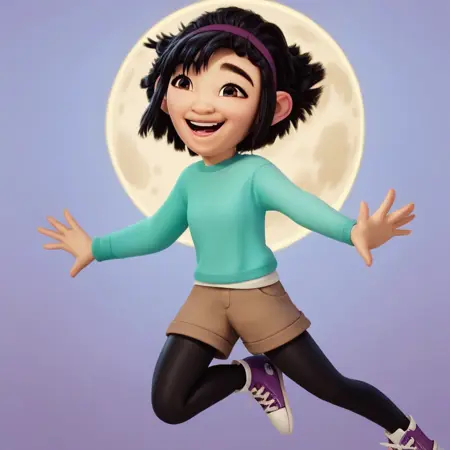 fei fei, over the moon, choppy black hair, brown eyes, purple hairband