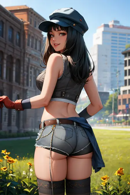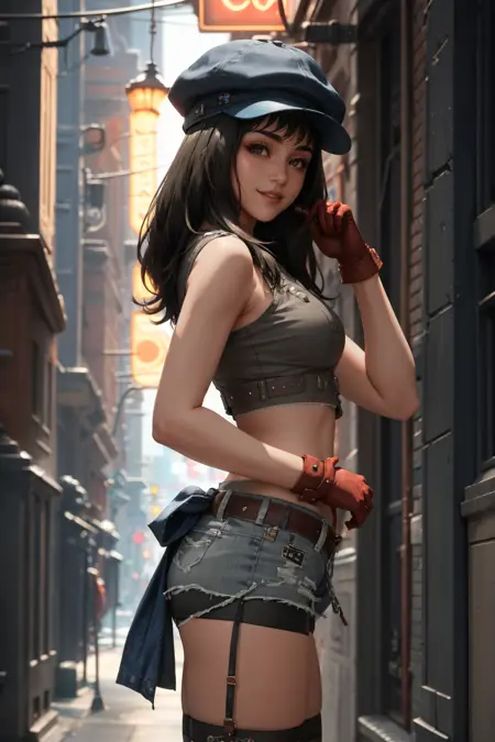 添加 "cabbie hat, red gloves, grey crop top, belt, short shorts, spandex shorts, layered clothing, striped thighhighs, lace-up boots" 以呈现她的典型造型。