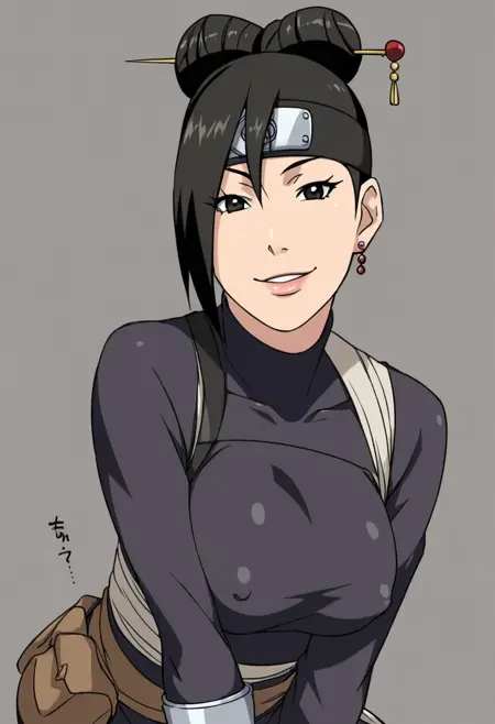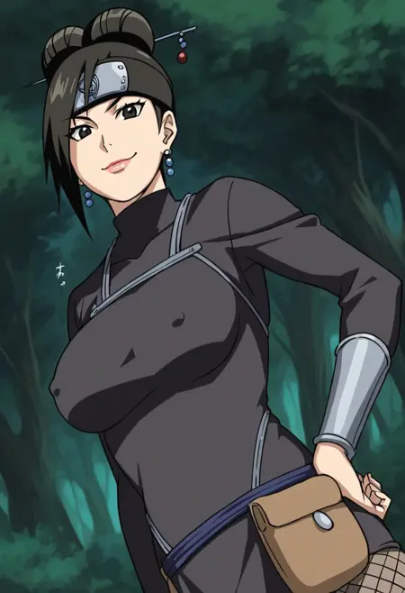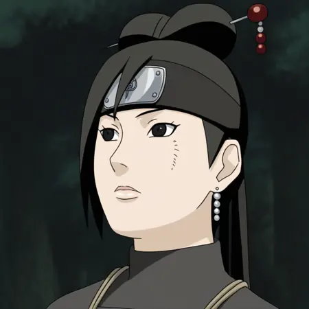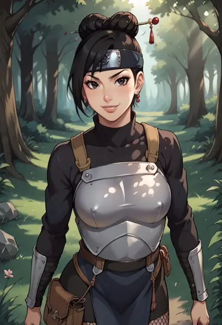 KoharuUtataneNS, 1소녀, 혼자, 아름다운 킨노치, 검은 눈, 검은 머리, 단발, 머리를 뒤로 묶음, 더블 번, 두 개의 진주가 달린 머리핀, 머리 장식, 이마 보호대, 귀걸이, 큰 가슴, 입술, 신노비 복장, 간단한 검은 복장, 가슴 보호대, 팔 보호대, 피시넷 타이츠, 치마, 등에 매달린 화장품, 붕대, 샌들, 보석, 보호대에 콘하가쿠레 문양, 띠, 긴 소매,