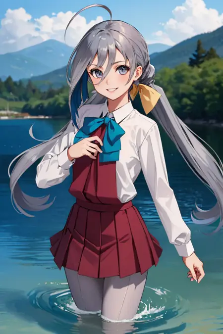 Default Outfit: school uniform, white shirt, bowtie, long sleeves, grey pantyhose