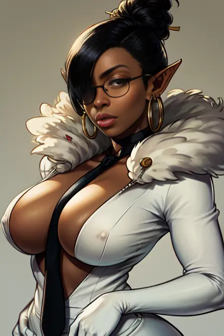 SprDres, glasses, black necktie between breasts,hoop earrings, hair stick,white gloves,, white dress with fur trim, ,cleavage, black footwear,