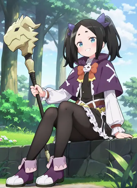 tokishikko_dana, black hair, twintails, long hair, hair ornament, thick eyebrows, blue eyes,futoku no guild