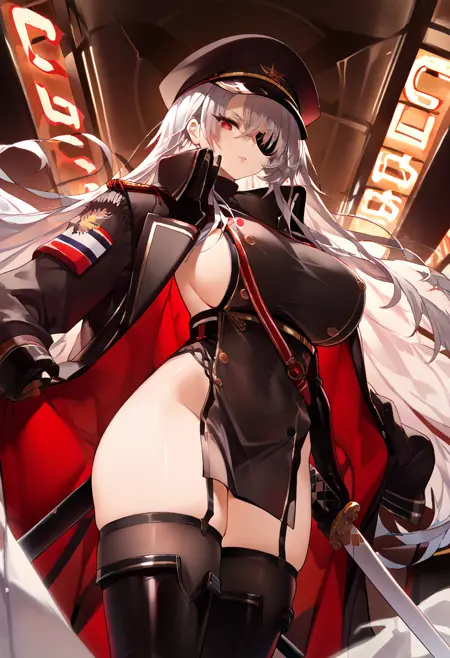- 戴帽子的军装:zfritzrumeya, 1girl, zfritz_outfit, rumeya_hat, eyepatch, white hair, long sidelocks, red eyes, solo, breasts, large breasts, thighhighs, gloves, hat, very long hair, jacket, weapon, white hair, thighs, boots, black gloves, elbow gloves, sword, holding weapon, uniform, military, black headwear, military uniform, sideboob, thigh boots, garter straps, holding sword, katana, sheath, peaked cap, military hat, jacket on shoulders