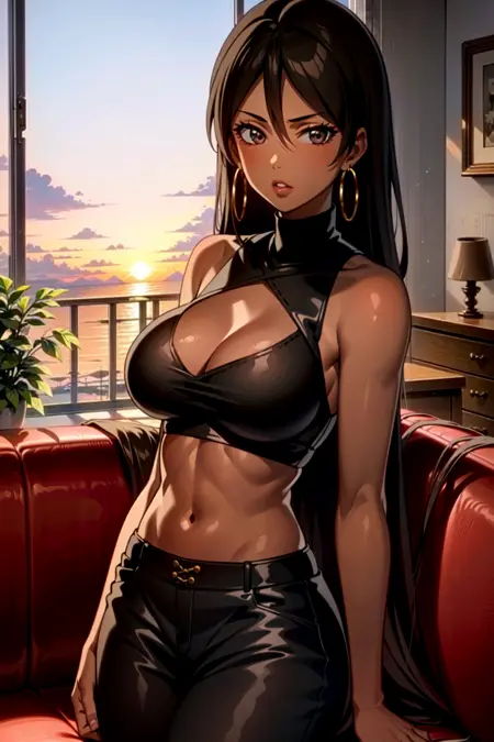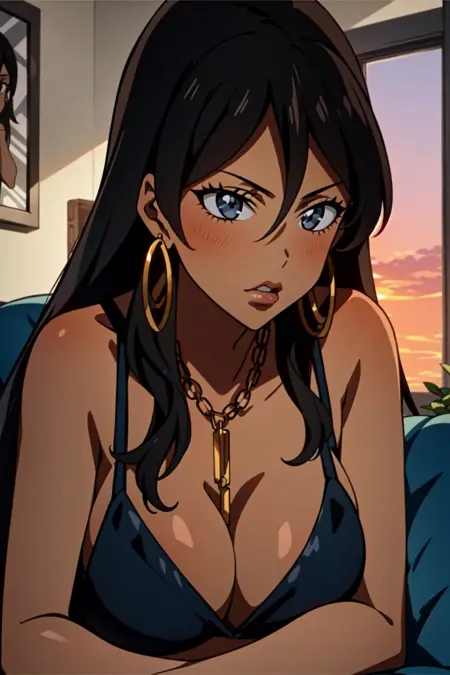 Michiko Malandro, 1girl, solo, dark skin, dark-skinned female, earrings, long hair, jewelry, black hair, hair between eyes, looking at viewer, brown eyes, halter top dress, glossy lips, eyeliner, make up