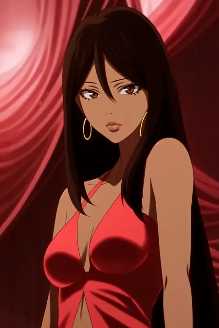 Michiko Malandro, 1girl, solo, dark skin, dark-skinned female, earrings, long hair, jewelry, black hair, hair between eyes, looking at viewer, brown eyes, halter top dress, glossy lips, eyeliner, make up