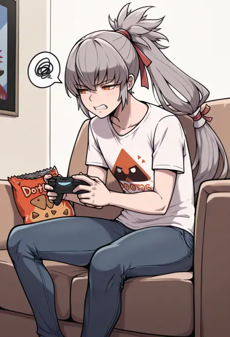맞춤 복장: dfTaku, 회색 머리, 폰테일, 긴 머리, 주황색 눈