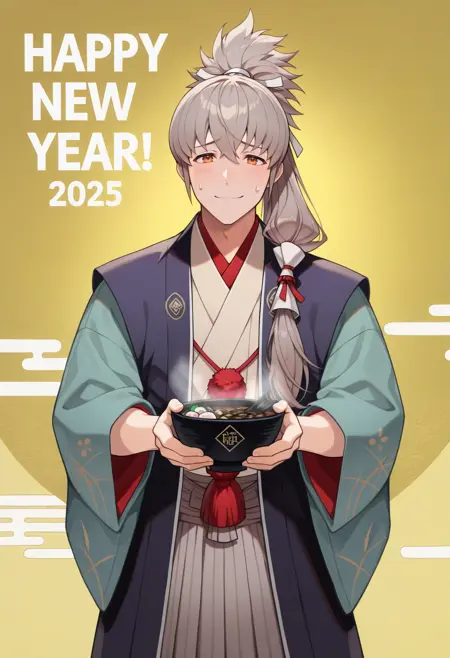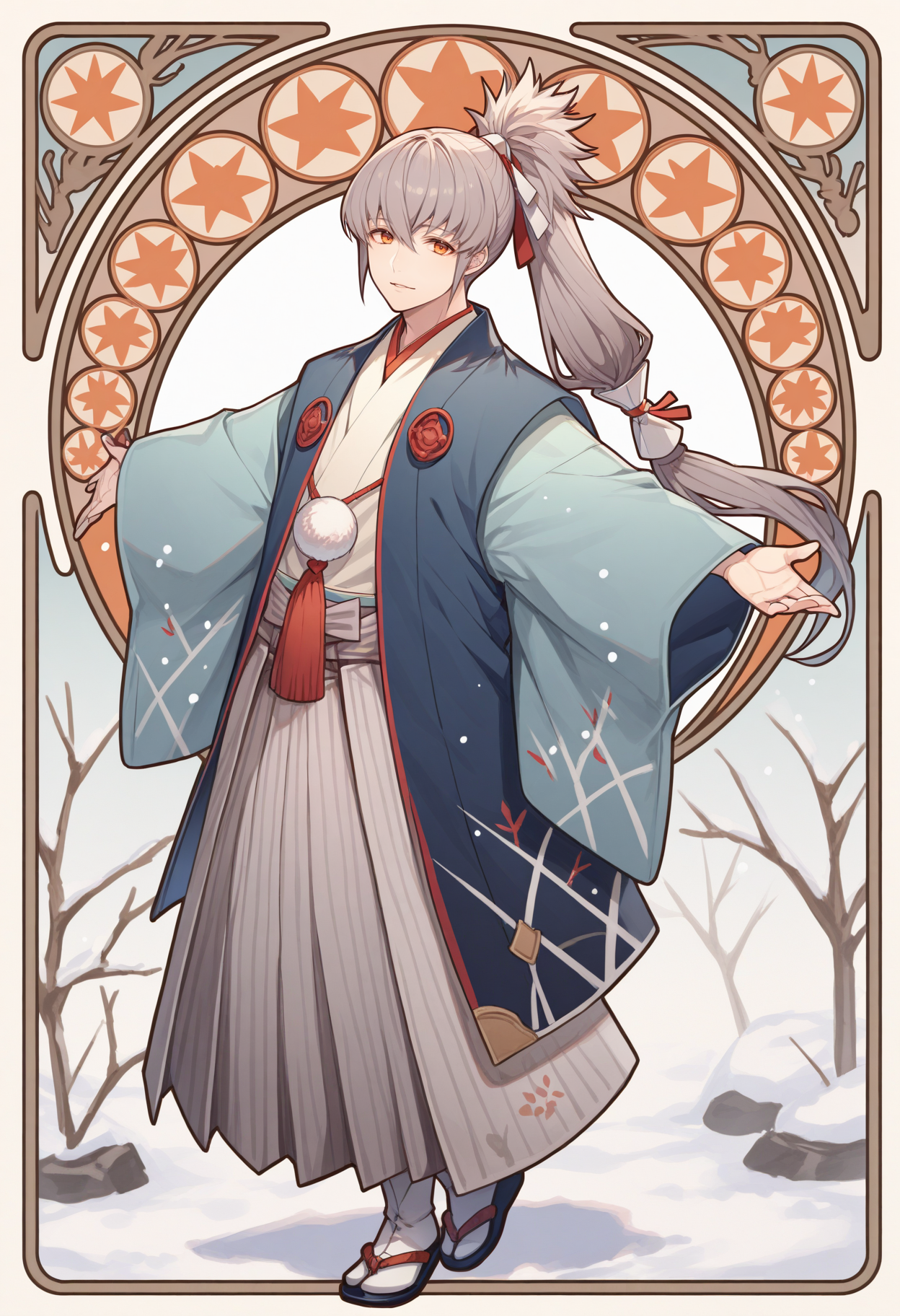 새해 복 많이 받으세요! (FEH): nyTaku, 회색 머리, 폰테일, 긴 머리, 시데 머리 리본, 주황색 눈, 파란 하카마, 넓은 소매, 아쿠아 소매, 회색 하카마 스커트