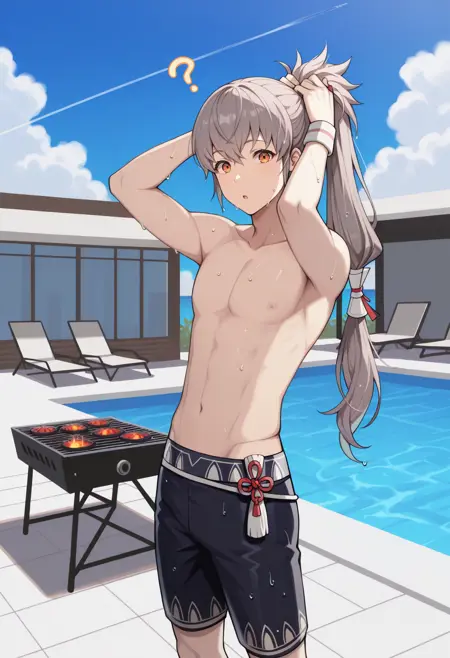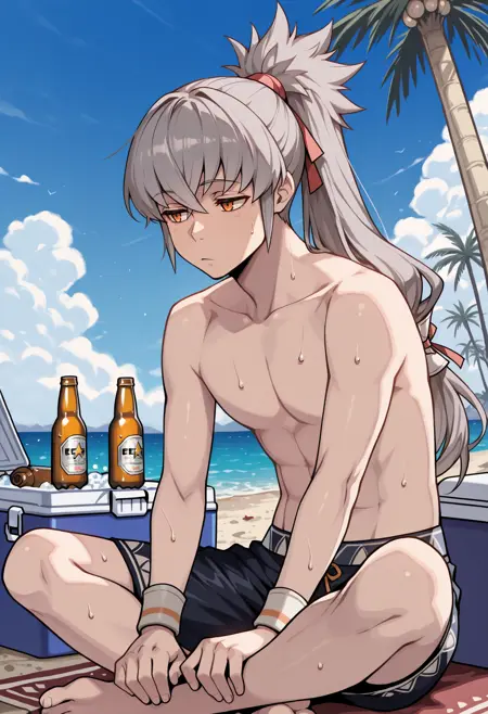 스케치 같은 여름 (FEH): smTaku, 회색 머리, 폰테일, 긴 머리, 빨간 머리 리본, 주황색 눈, 상반신 노출 남성, 팔찌, 검은 수영복