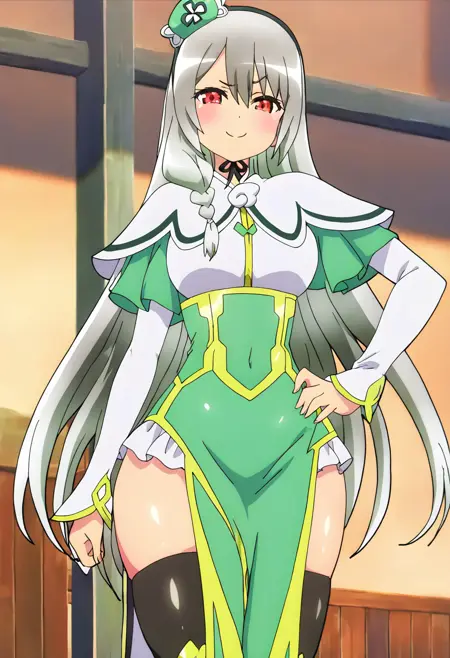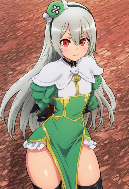 zzMaidena, 빨간 눈, 눈 사이의 머리카락, 회색 머리카락, 긴 머리카락, 헤어밴드, 부츠, 프릴, 검은 허벅지 긴 양말, 캐플릿, 허벅지 부츠, 녹색 드레스, 녹색 머리 장식,