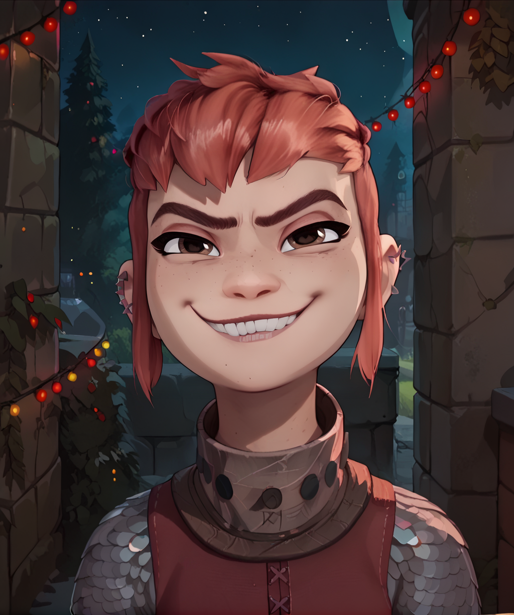 니모나, 단발적 붉은 머리카락, 옆머리, 검은 눈 또는 갈색 눈,