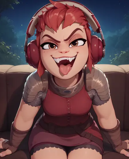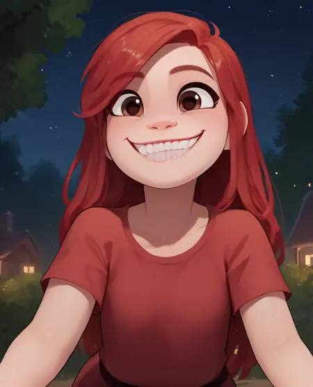 Nimona, short red hair, sidelocks, black eyes, or brown eyes,