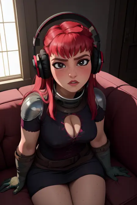 Nimona, short red hair, sidelocks, black eyes, or brown eyes,