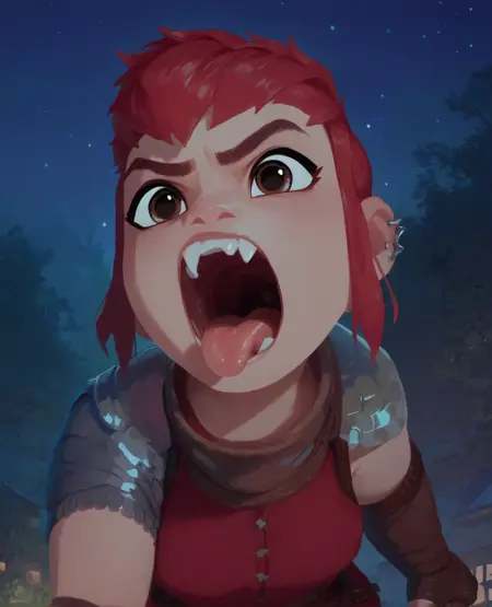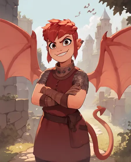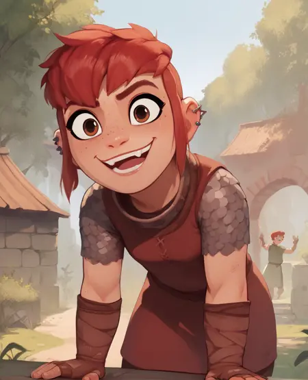 Nimona, short red hair, sidelocks, black eyes, or brown eyes,