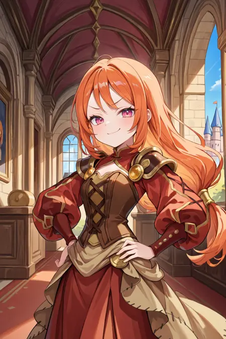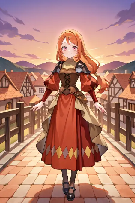 유용한 태그: 1girl, 분홍 눈, 긴 머리, 오렌지색 머리, 낮게 묶인 긴 머리, 줄리엣 소매, 빨간 줄리엣 소매, 어깨 패드, 흰색 버클, 검은 팔 보호대, 패치워크 옷, 레이어드 드레스, 베이지색 셔츠, 단추 달린 셔츠, 단추, 코르셋, 갈색 코르셋, 긴 치마, 빨간 치마, 허리 캡, 베이지색 허리 캡, 긴 소매, 팬티스타킹, 메리 제인 신발, 검은 신발