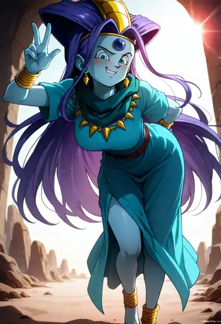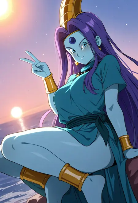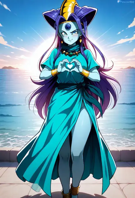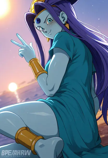prompt is: blue eyes,detailed eyes,blue skin,very long hair,purple hair,dress,blue dress,aqua dress,dragon ball (object),forehead jewel,jewelry,gold headdress,gold earrings,gold bracelet,multiple anklets,multiple bracelets,necklace,colored skin,aqua skin,barefoot