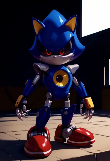 Metal Sonic, robot, blue metal skin, black sclera, red pupils, pointy metal nose, gray claws, yellow core, red shoes