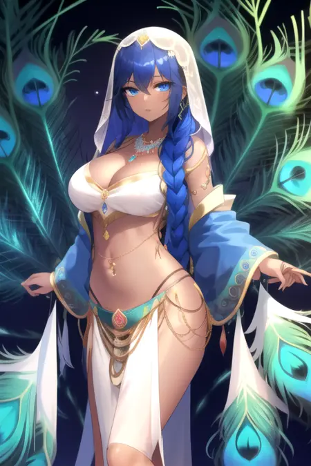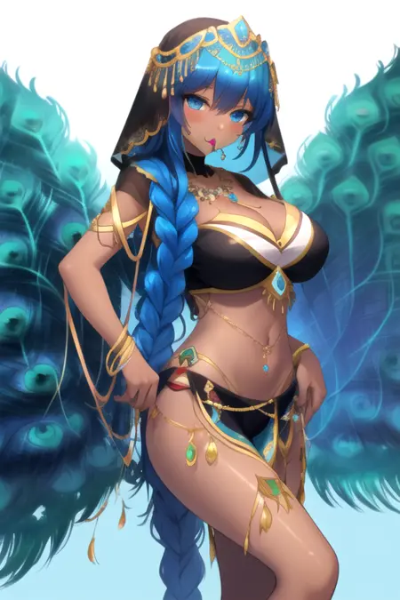 DiamondIllusion, 1girl, solo, very long hair, blue eyes, large breasts, navel, cleavage, jewelry, blue hair, single braid, peacock wings, midriff, dark skin, necklace, dark-skinned female, navel piercing, mouth veil,