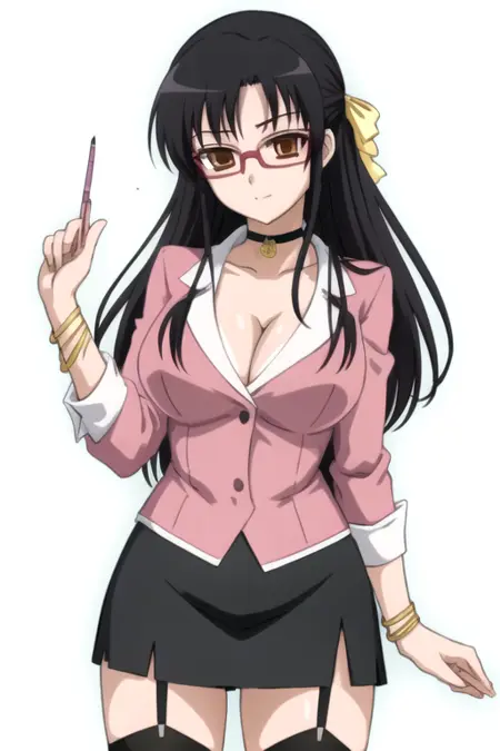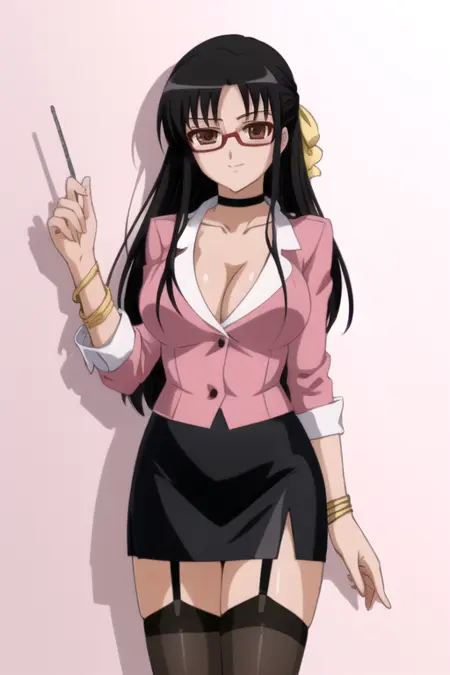 NogikuNago, 1girl, solo, long hair, miniskirt, large breasts, black hair, black thighhighs, hair ribbon, cleavage, brown eyes, jewelry, glasses, choker, bracelet, garter straps, pencil skirt, skirt suit, pinl shirt