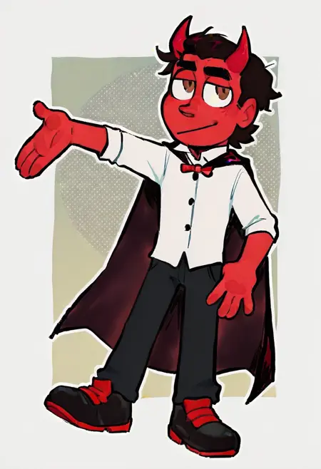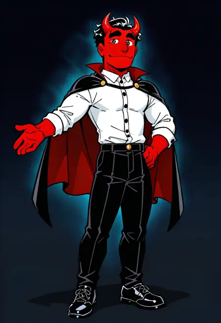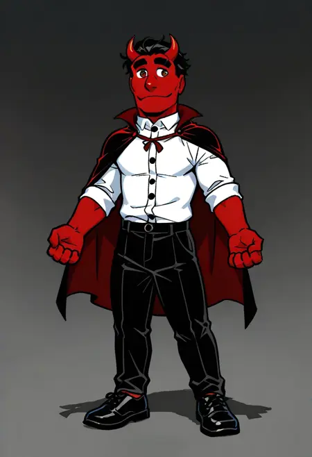CraigTheDevilSML, 1boy, white shirt, black pants, black and red cape, He has red skin, red devil horns, black hair, and black shoes, brown eyes, black thick eyebrows