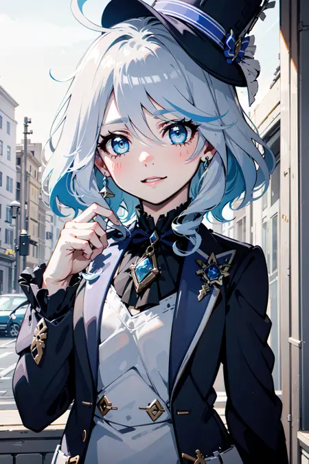 提示词:1girl, blue hair, blue eyes, hat, foca_dress, short pants,