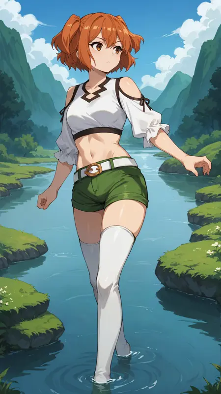橙色头发,短发,两侧向上,棕色眼睛,短双马尾,白色上衣,露肩设计,露脐,短款上衣,白色腰带,绿色短裤,超短裤,白色大腿靴