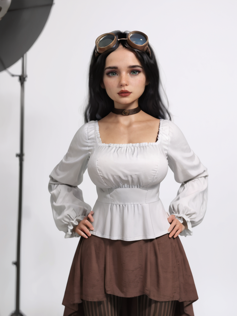 amelia_gm, black hair, blue-green eyes, long hair, parted hair, eyebrows, lips, large breasts, aviator goggles, goggles on top of head, brown leather choker, white blouse, low-cut blouse, frilly neckline, long sleeves, puffy sleeves, flared cuffs, brown skirt, asymmetrical-length skirt, brown leggings, horizontal-striped leggings, lipstick, eyeliner, eyeshadow, brown knee boots