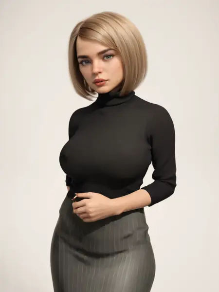 black turtleneck shirt, long sleeves, gray pinstripe pencil skirt, knee-length skirt, eyeliner, lip gloss, black high heels