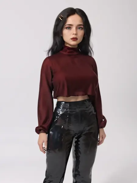 amelia_gm, black hair, blue-green eyes, long hair, parted hair, eyebrows, lips, large breasts, hair clip, (dark red) turtleneck blouse, long sleeves, loose sleeves, sleeve cuffs, midriff, black glossy pants, high-waisted pants, lipstick, eyeliner, eyeshadow, red high heels