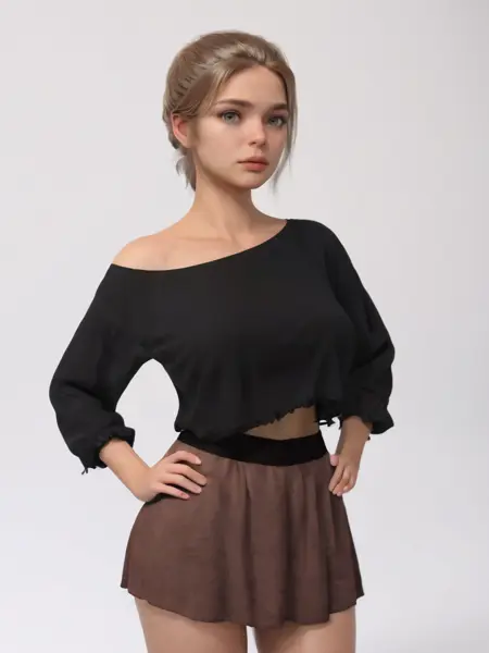 black off-shoulder blouse, one bare shoulder, elbow sleeves, frayed shirt hem, midriff, black waistband, brown miniskirt