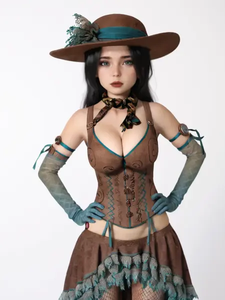 amelia_gm, black hair, blue-green eyes, long hair, eyebrows, lips, large breasts, brown leather corset, leather collar, leather straps, low-cut corset, blue-green trimmed corset, cleavage, midriff, teal lace arm-length gloves, rings, blue-green arm cuffs, brown skirt, asymmetrical-length skirt, teal lace hemmed skirt, fishnet stockings, compass at waist, brown wide-brim hat, blue-green hat ribbon, colorful scarf, lipstick, eyeliner, eyeshadow, brown ankle boots