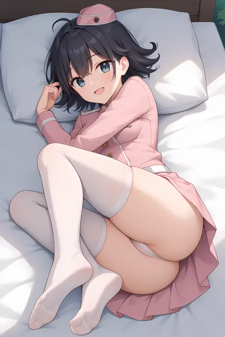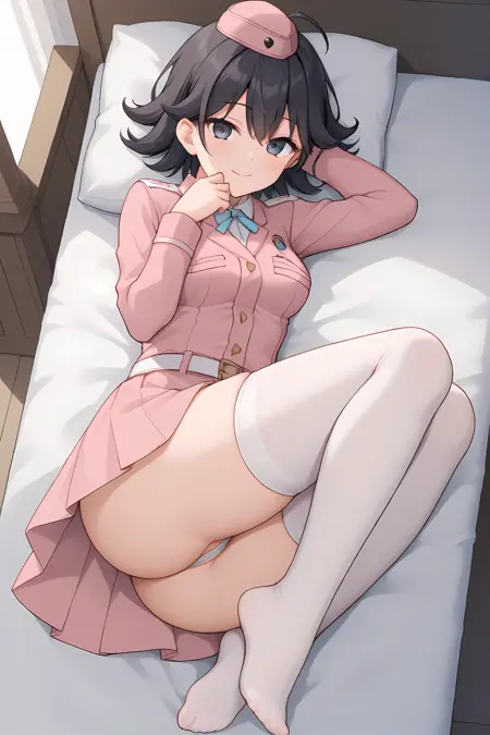 분홍색 갠리슨 모자, 분홍색 유니폼, 분홍색 치마, 허리 끈, 흰색 허벅지 긴 양말