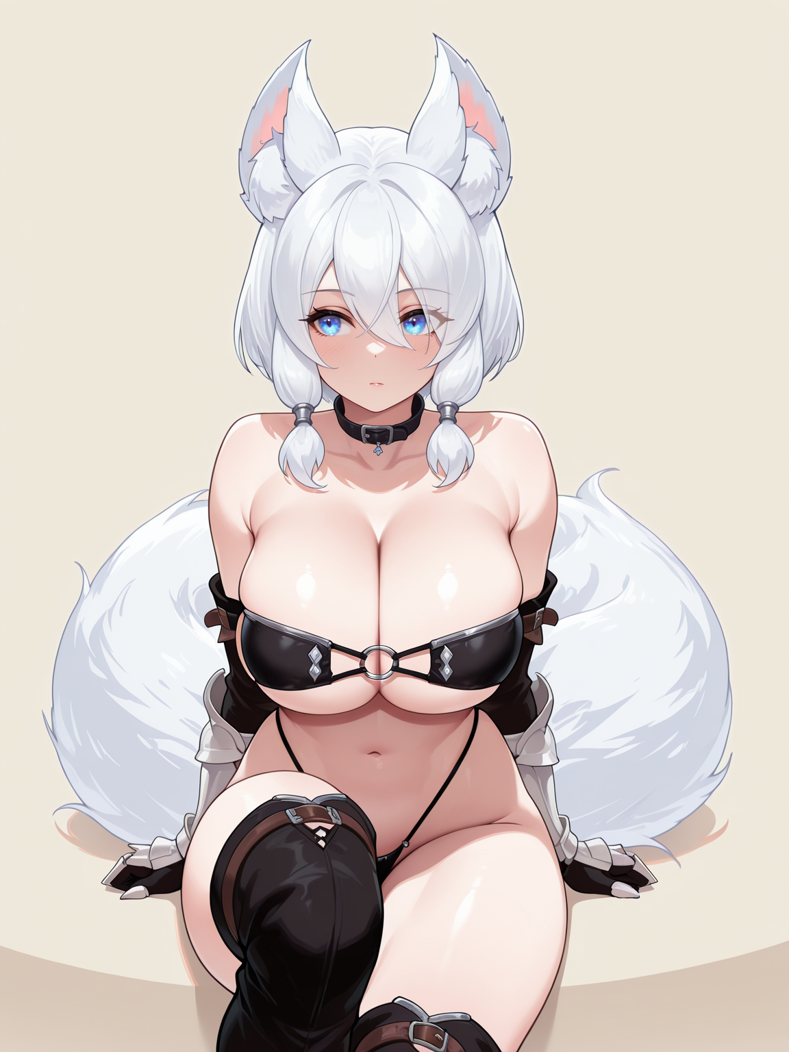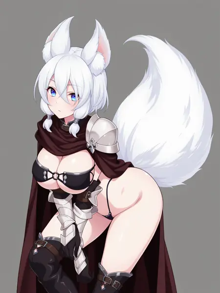 外見:illulu、白髪、短髪、低めのツインテール、青い目、狼の耳、狼の尾、大きな胸