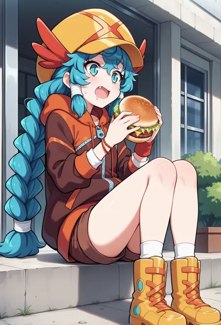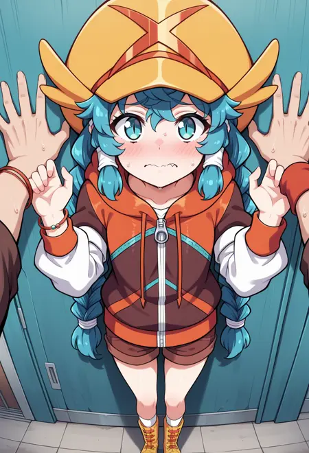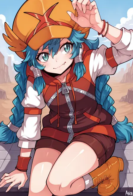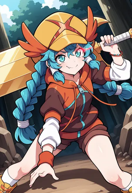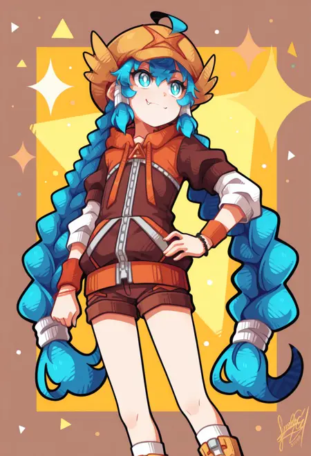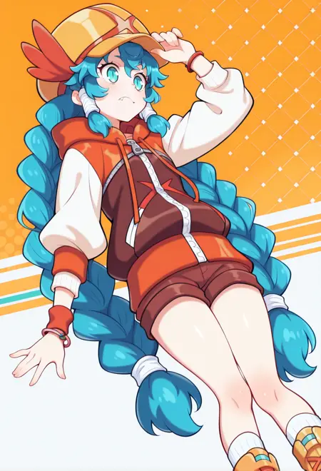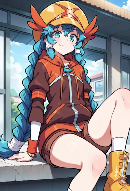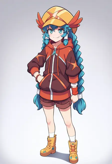 黄色い帽子、茶色のフーディー、重ね着された袖、短い袖が長い袖の上、白い袖、ジッパー、ブレスレット、オレンジ色のリストバンド、単一のリストバンド、茶色のショートパンツ、白い靴下、黄色いブーツ、