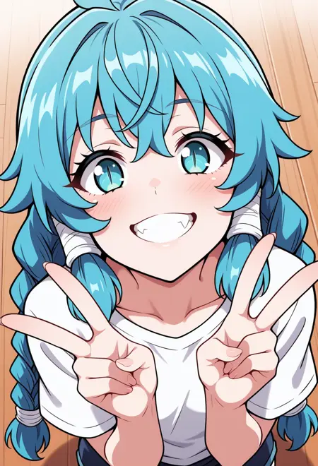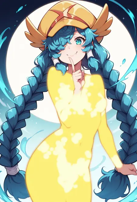 青い目、縦に細い瞳孔、青髪、二重編み、横髪、髪のチューブ、非常に長い髪、