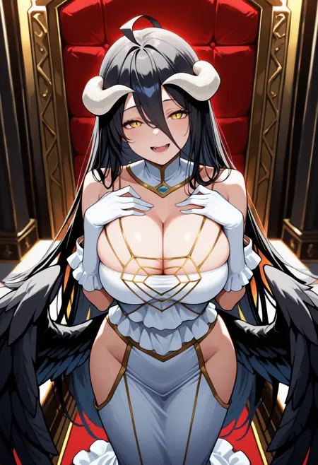 Default Outfit: alb3dodef, black wings, demon wings, feathered wings, low wings, long hair, black hair, hair between eyes, ahoge, white horns, demon horns, yellow eyes, slit pupils, long dress, white dress, off-shoulder dress, frilled dress, detached collar, hip vent, white gloves, elbow gloves, bare shoulders, cleavage, large breasts