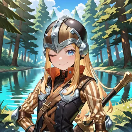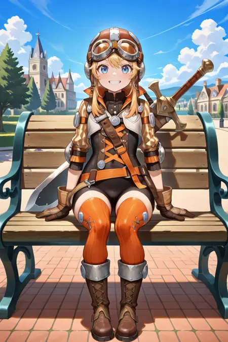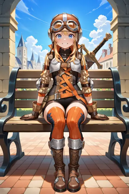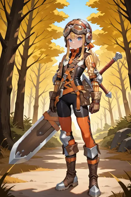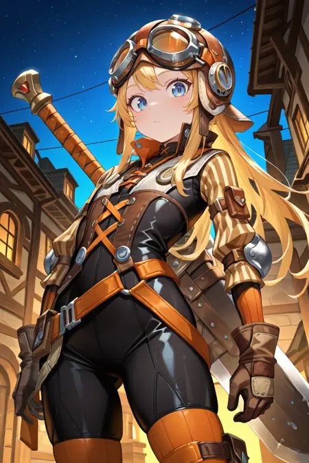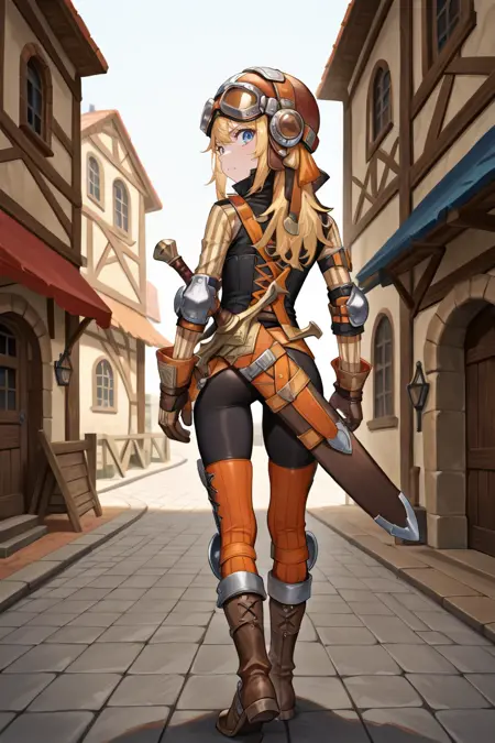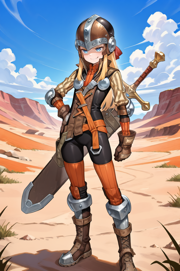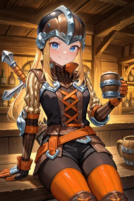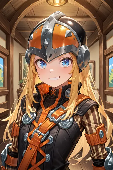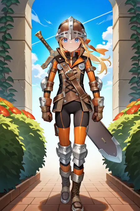 有用标签: 1个男孩,金色头发,侧发,长发,蓝眼睛,头盔,盔甲,肘部护垫,橙色腰带,立起的衣领,层叠衬衫,交叉系带上衣,黑色紧身衣,衣服下的紧身衣,条纹袖子,长袖,橙色过膝袜,手套,靴子,背部武器