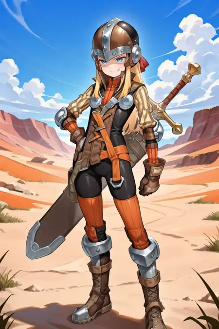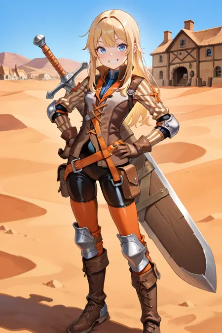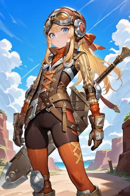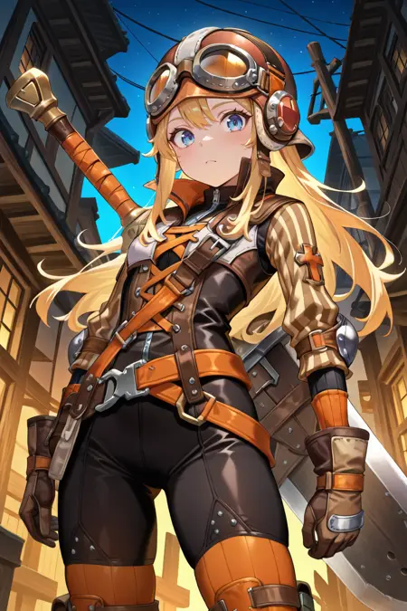 Helpful Tags: 1boy, blonde hair, sidelocks, long hair, blue eyes, helmet, armor, elbow pads, orange straps, popped collar, layered shirt, cross-laced top, black bodysuit, bodysuit under clothes, striped sleeves, long sleeves, orange thighhighs, gloves, boots, weapon on back