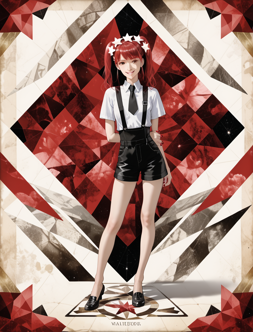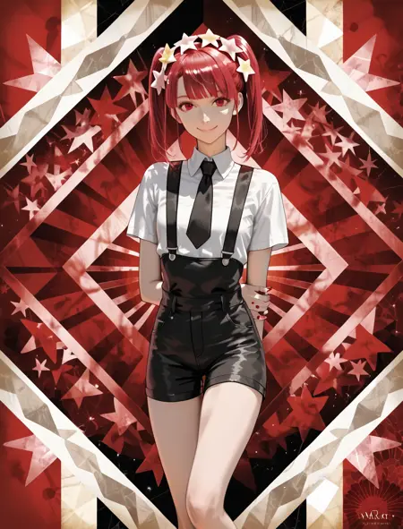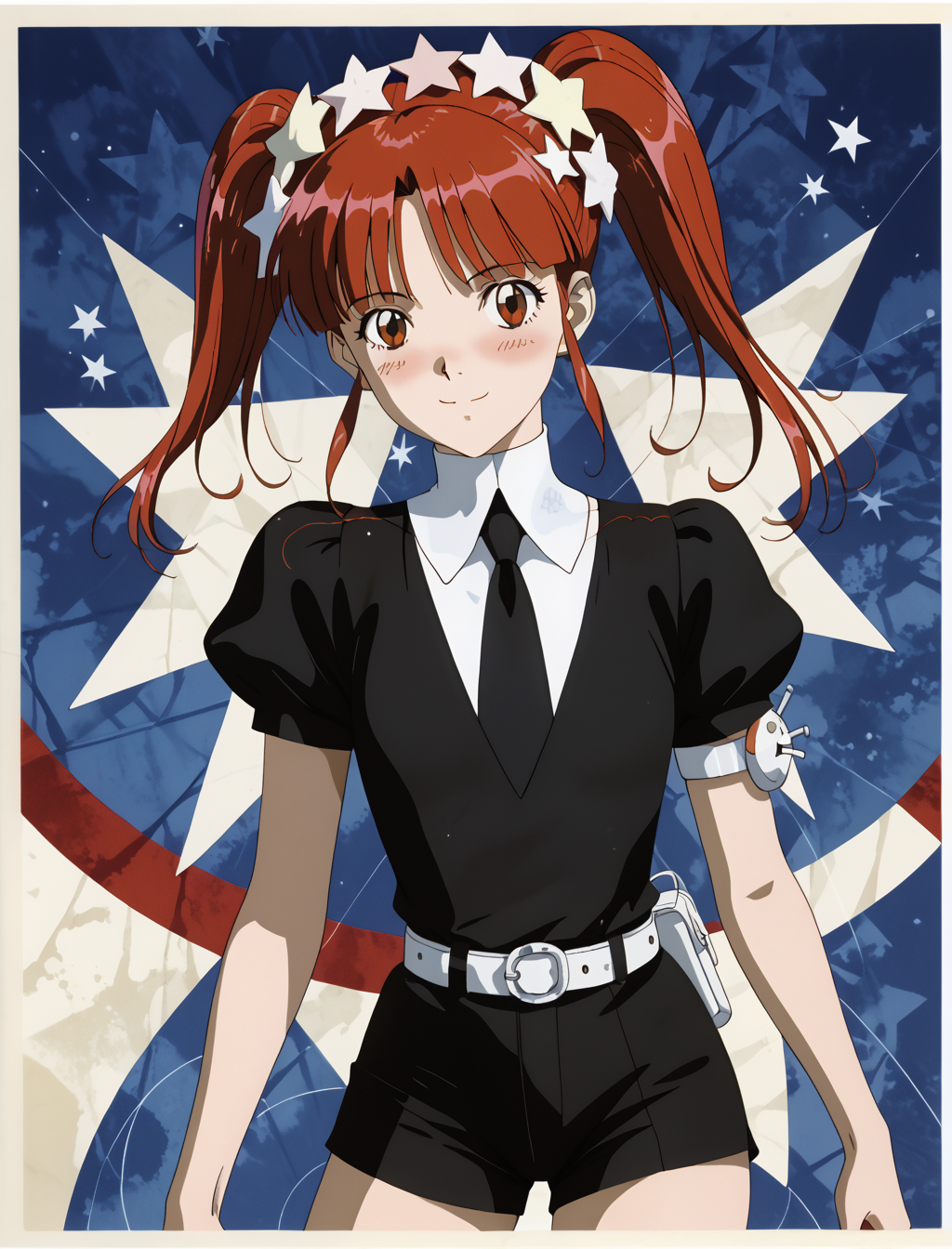 high collar, puffy short sleeves, necktie, white shirt, black jacket, belt, black shorts