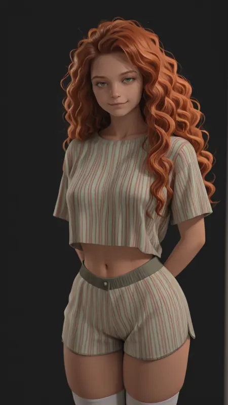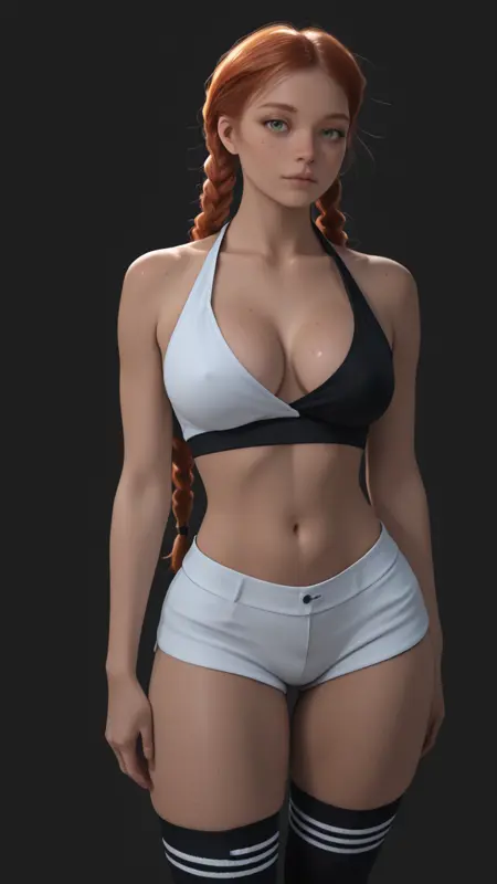 elisa_gm, orange hair, green eyes, long hair, lips, eyebrows, freckles, body freckles, medium breasts,