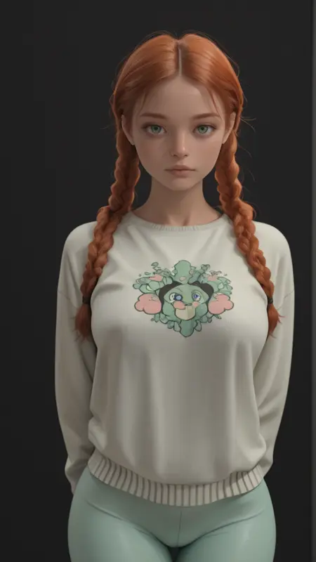 white knitted sweatshirt, long sleeves, cartoon print, sweatshirt hem, mint green leggings, tight leggings, gray and white ankle socks, gray hearts
