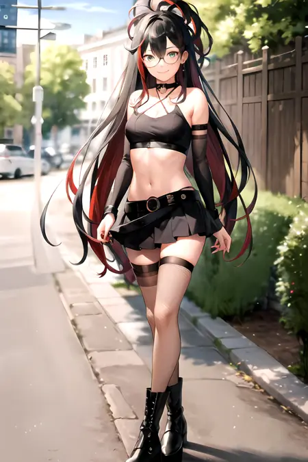 | トレーニングワード | long hair, skirt, black hair, thighhighs, navel, cleavage, bare shoulders, jewelry, very long hair, green eyes, collarbone, red hair, earrings, small breasts, boots, detached sleeves, choker, midriff, belt, miniskirt, black skirt, black footwear, streaked hair, crop top, thigh strap, halterneck, black choker, ring, cross, single thighhigh, fishnets, black nails, asymmetrical legwear, black belt, platform footwear, straight-on, fishnet thighhighs, cross earrings, platform boots,コピーしました! |